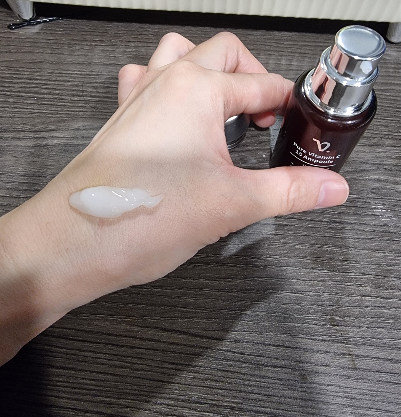 수분감이 상당해서 극 건성인 저도 기미앰플 바르고 크림바르는 거 깜빡해도 피부가 쫀쫀한 느낌이 들어 좋았습니다. 저 흰색의 제형 보이시죠? 저는 아껴쓴다고 저녁만 쓰고 오래 썼더니 한병 다써가는 마지막에는 살짝 노란끼가 돌더라구요. 아..비타민C가 오래되면 진짜 색이 변하는구나를 실제로 느끼고 제품에서 설명한 내용이 맞구나를 느꼈습니다. 실제로 느끼고 다니 한병을 더 써보자 싶더라구요.