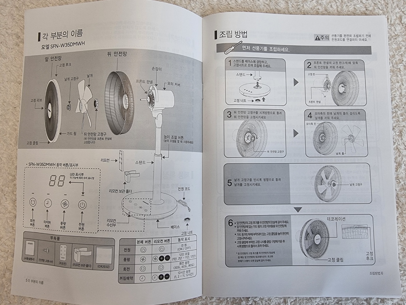부품 빠진것 없이 잘 왔는지 확인 한번 해주고, 설명서 쓰윽 한번 봐줍니다. 저는 제품 설명서를 먼저 보는게 항상 습관이라 ㅎㅎ 그래야 마음이 편합니다. 조립방법 6번 한번 잘 봐주세요. 안쪽에 고정 후크들이 있으니 잘 맞춰 껴줘야 합니다. 나중에 저도 잘 걸쳤다고 생각했는데 아니더라구요. 딱딱 소리가 나도록 모든 부분을 잘 확인해 주세요.