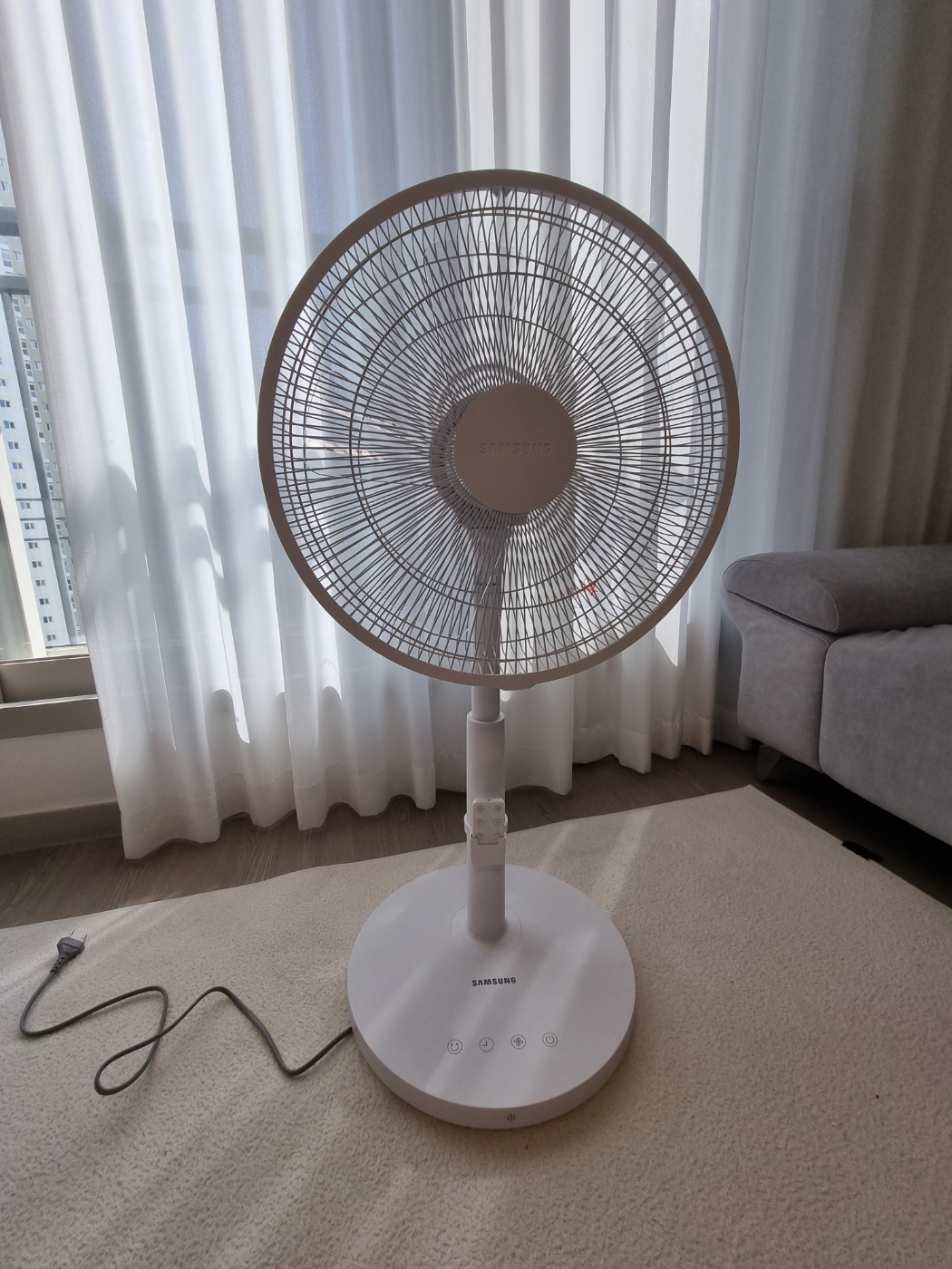 드디어 완성 했습니다. 완전 싸구려 플라스틱 같지 않아서 좋습니다. ㅠㅠ 가볍다고 홍보하는 제품들 중에 너무 소재가 가볍고 싸구려 느낌이라 잘 따져 보셔야 합니다. 삼성 선풍기 제품은 적당한 무게와 깔끔한 마감이 돋보이네요. 색깔도 전혀 촌스럽지 않은 흰색이였어요.