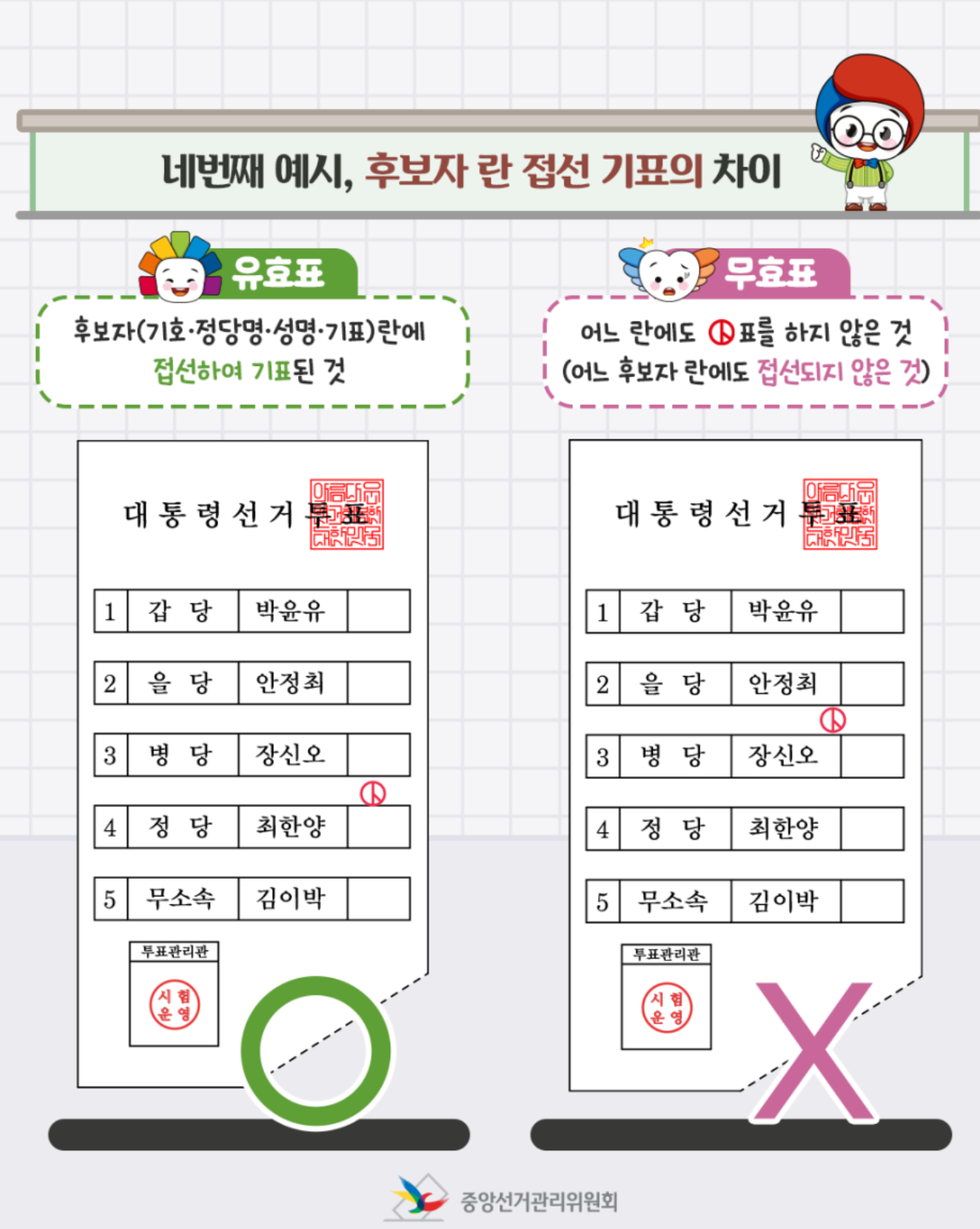 기표는 꼭 후보자 칸안에 들어갈수 있도록 신중하게 찍어주세요. 후보자란에 완전히 벗어나면 무표효가 될수 있습니다.